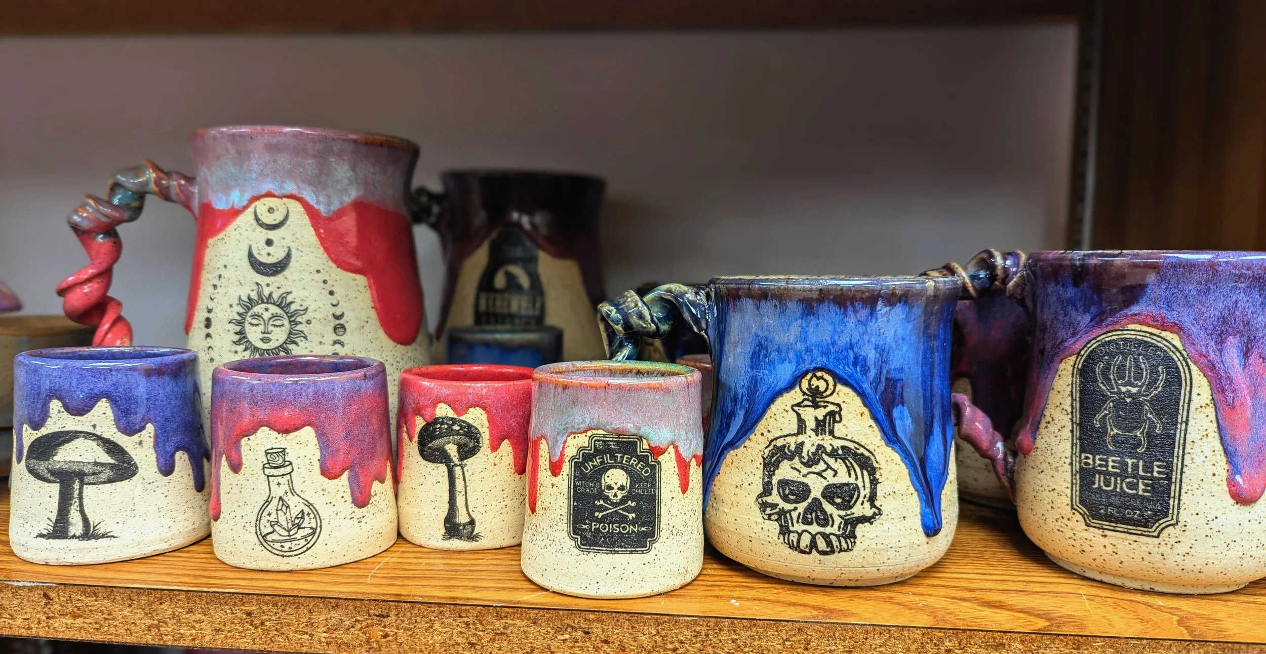 West Jensen is a queer artist living and working in Pocatello Idaho with his wife and child. He is skilled in a variety of mediums with an intense focus in and interest in functional pottery. His work explores a sense of nostalgia for a time that never really existed. He takes occult and fantasy imagery, mixes them with vivid intense glazes, and a deep appreciation for the beauty of bare clay to make whimsical and functional pottery.